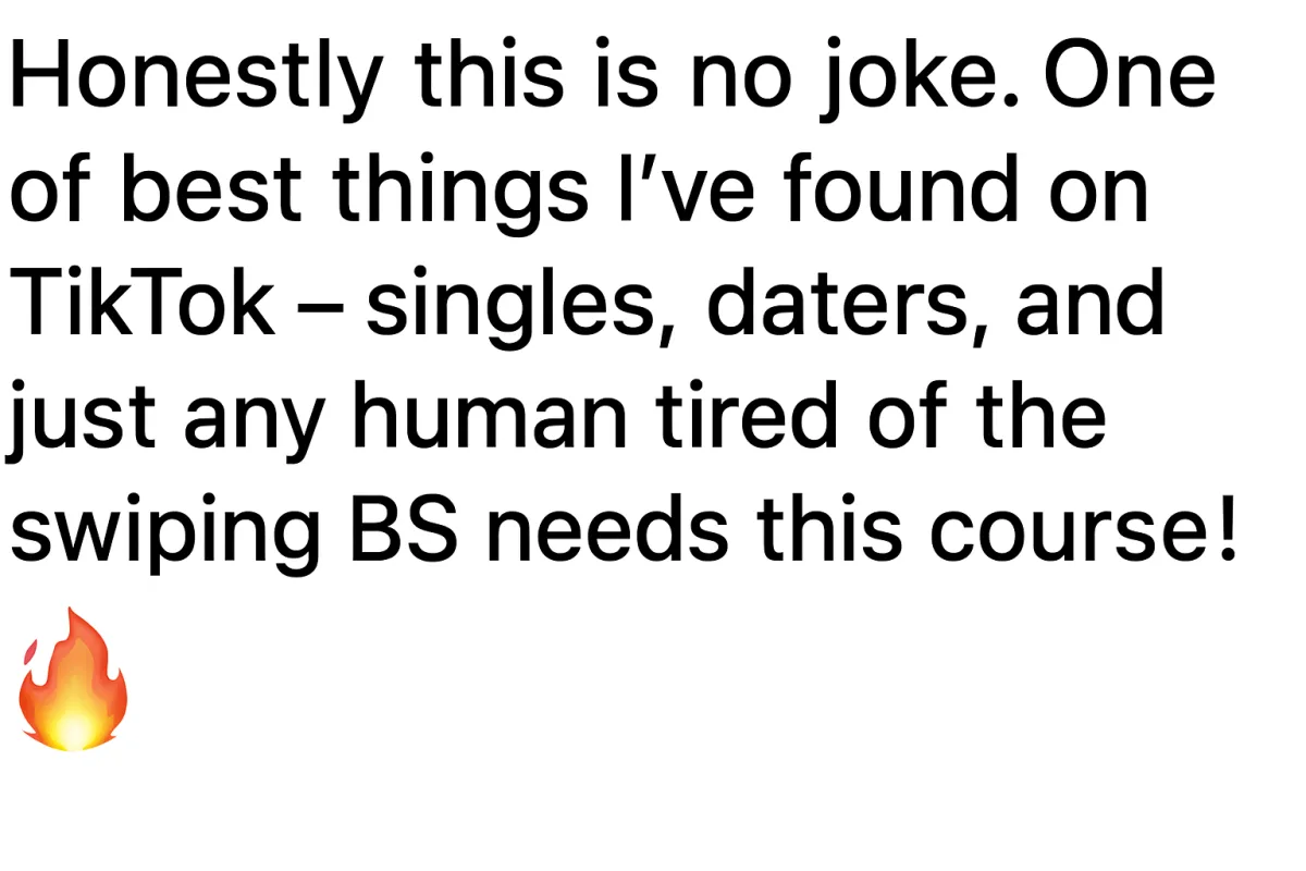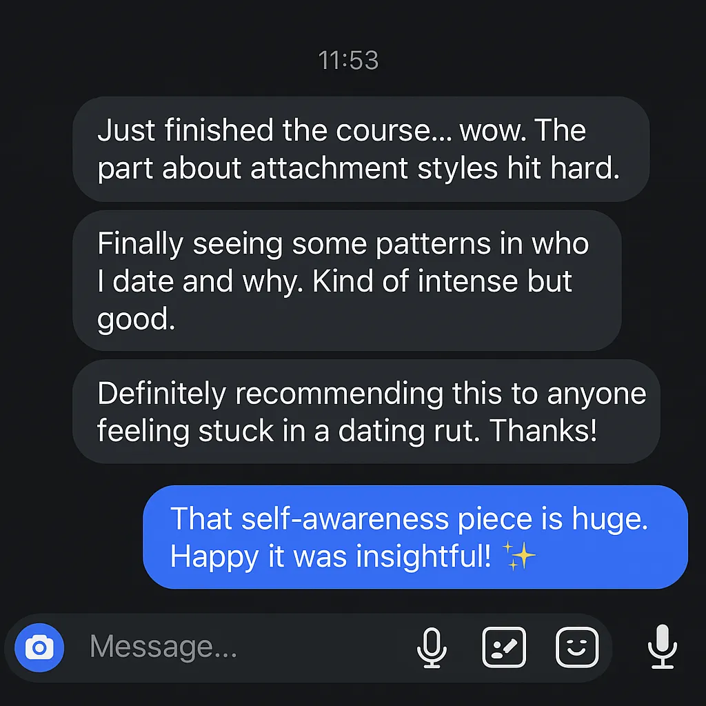 "Super practical course. I thought my profile was decent, but the tips made me realize I could make it way better – actually got more responses after tweaking it based on the 'show, don't tell' advice. The pre-dating workbook and the date diary idea are genius too, really makes you think instead of just reacting to everything."